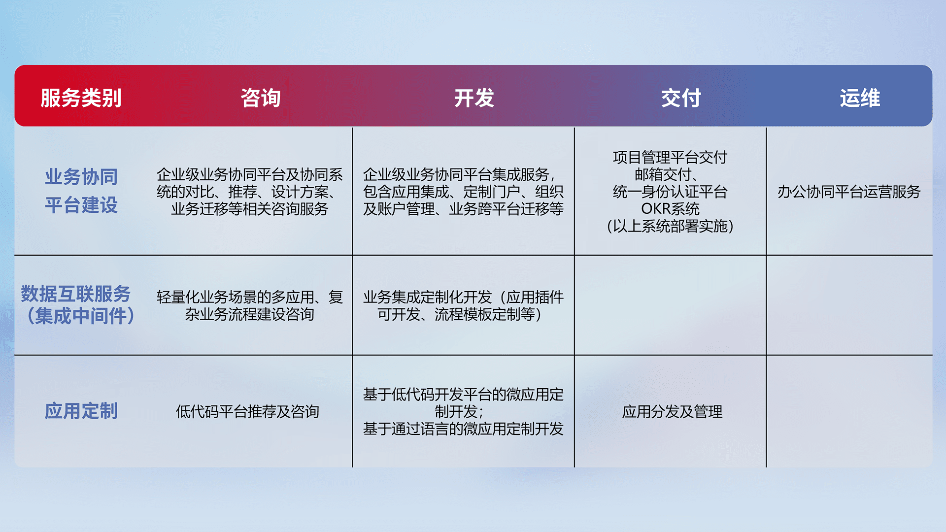 针对钉钉、、、、企微、、IDaas等平台级产品提供产品的规划、、、、方案、、、、交付、、、、定制化开发等服务,,,,实现如统一协同办公、、、、智能客户服务、、、混合会议管理、、、智能数据查询、、等业务场景,,,,实现数字化转型。。。
